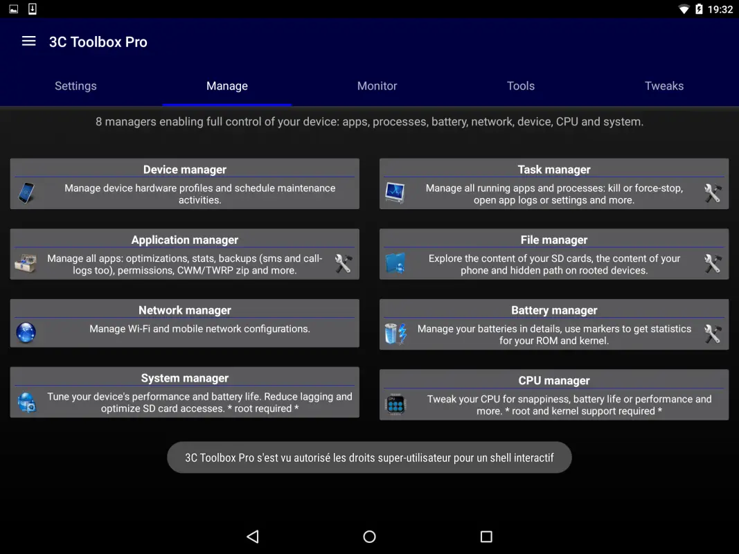 The secret to releasing the 3C All-in-One Toolbox's maximum potential. For existing pro-alone installations, the app icon will present a link to install the main APK and open a small dialog box allowing you to export your current app settings.