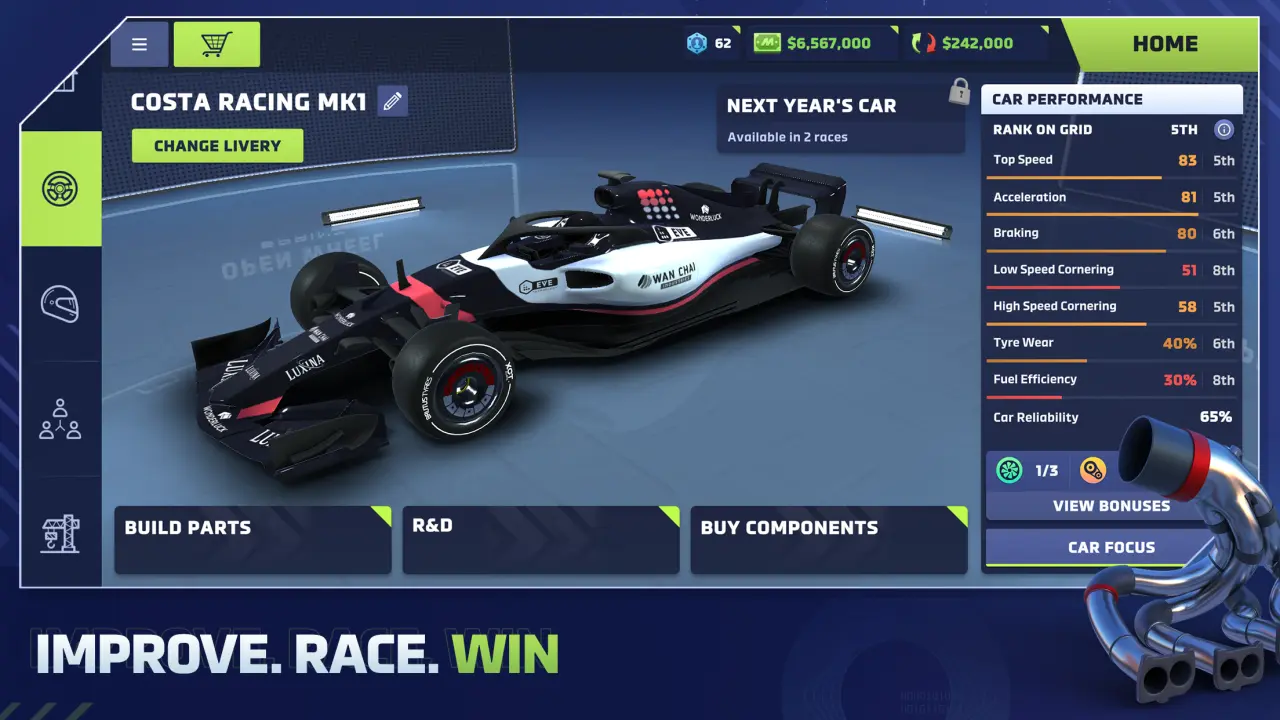 Immerse yourself in the thrilling adventure of building your motorsport business from the ground up. Navigate the redesigned headquarters, experiment with the fresh new R&D system, and master the new part development process for an engaging adventure.